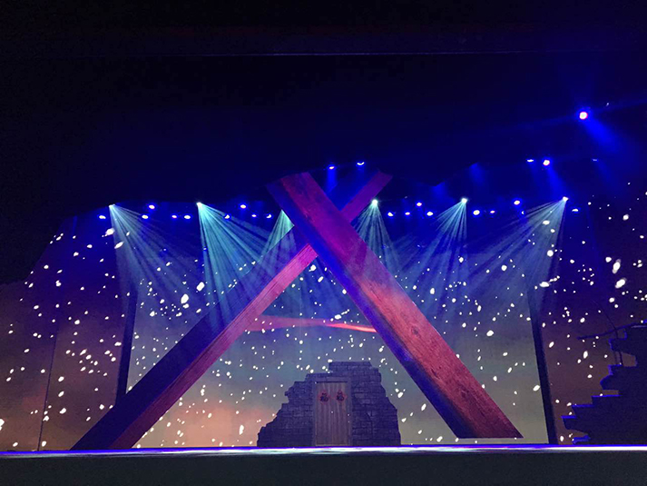 "我從舞臺劇的燈光設(shè)計思路出發(fā),用沿幕把所有燈具在舞臺上隱藏起來,使觀眾看不見燈具只看見色彩和光線。這次晚會共采用了80臺1500w圖案燈(特寶麗V2500S)、60臺1500w染色燈、120臺光束燈(特寶麗PT320B)、160臺LED燈、40臺切割燈(特寶麗V3000P)以及4臺追光燈(特寶麗FS300M)。切割燈特寶麗V3000P主要做面光使用,用于把舞臺多余的光切掉,使舞臺更干凈更透亮,同時也讓演員和舞美道具等清晰可見?!靶′撆凇焙蒲蠊馐鵁鬚T320B主要用于打造炫目的舞臺效果;我在設(shè)計中將圖案燈里面的圖案與染色燈的色彩功能充分疊加之后鋪照在舞臺上,這種方式能夠呈現(xiàn)出更加繽紛和絢麗的圖案效果;地流燈和側(cè)光的運(yùn)用則讓每一位演員都在舞臺上呈現(xiàn)更加立體。