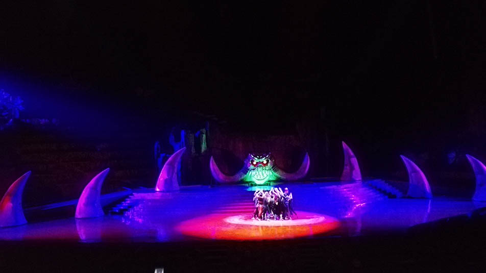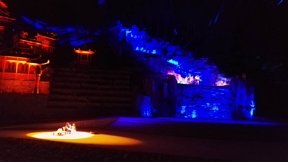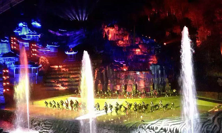 《薩瑪》以梵凈山下的侗族村寨、山水、竹海為背景,講述了發(fā)生在遠古侗族山寨里女主角“薩瑪”身上的凄美愛情故事??可矫嫠⒏叨瘸睗竦难莩霏h(huán)境,對燈光設備的質(zhì)量提出了極高的要求。該項目共使用浩洋電子旗下特寶麗(Terbly)品牌大功率LED切割燈GL-6、LED搖頭染色燈GLW190Z、搖頭圖案燈V1501S、追光燈FS800M、條形染色燈PB8D、及沉水式LED變色燈等合計近600臺。