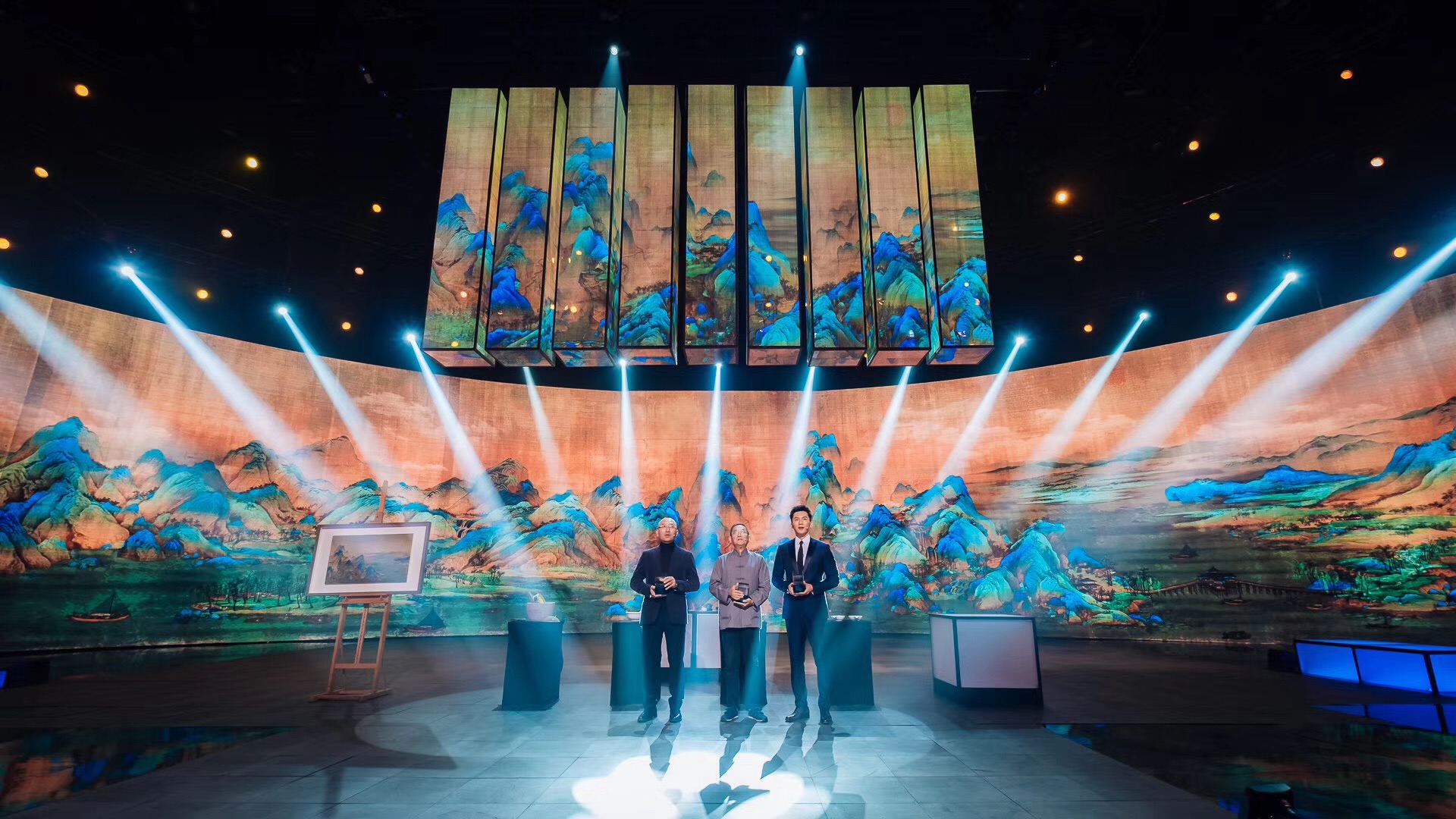在舞美方面,《國家寶藏》節(jié)目組特別將所有舞臺(tái)主視覺都設(shè)置在一塊長43米、高7米的巨型LED環(huán)幕上,讓觀眾在見不到國寶實(shí)物的情況下也能以直觀的感受體驗(yàn)到國寶的震撼美。在整個(gè)舞臺(tái)的設(shè)計(jì)上,節(jié)目組將中國古典韻味和現(xiàn)代舞臺(tái)科技相結(jié)合,融合紗盒投影視覺呈現(xiàn)、透視冰屏柱視覺呈現(xiàn)、透視冰屏柱臺(tái)型變幻、巨型環(huán)幕視覺呈現(xiàn)四大特點(diǎn)于一體。在場(chǎng)景環(huán)境的構(gòu)建與更替上都呈現(xiàn)出精致逼真的舞臺(tái)效果,這種舞臺(tái)視覺上的極致沖擊力也成為節(jié)目吸引眼球的一大亮點(diǎn)。