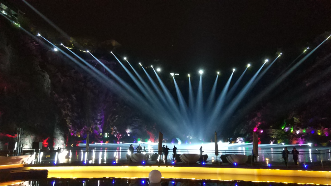 酒店沿崖壁而建,面向橫山,戶外工程環(huán)境復(fù)雜,其深坑巖壁的曲面造型,致使燈具懸崖運輸,特別是位于崖壁下的安裝工程,由于地理環(huán)境的限制,無法采取常規(guī)施工技術(shù)方案,為浩洋工程部增加了極大的工程施工難度。但我們的團隊并沒有氣餒,而是迎難而上,在確保高工藝水準的情況下,以專業(yè)的工程專業(yè)技術(shù)能力和高度負責(zé)的態(tài)度,針對本項目特殊地勢制定專門的施工方案,克服了大范圍水上作業(yè)、高空懸崖作業(yè)安裝等重重困難,最終如期、高質(zhì)量的完成項目。另外,浩洋的團隊除了承擔(dān)燈光設(shè)備的安裝工作外,還積極參與整體控制系統(tǒng)的融合、同步控制工作,保證了總導(dǎo)演的設(shè)計理念得以完美實現(xiàn),打造出一場震憾的、聚集各種創(chuàng)意視覺的的奇境光影水秀。
