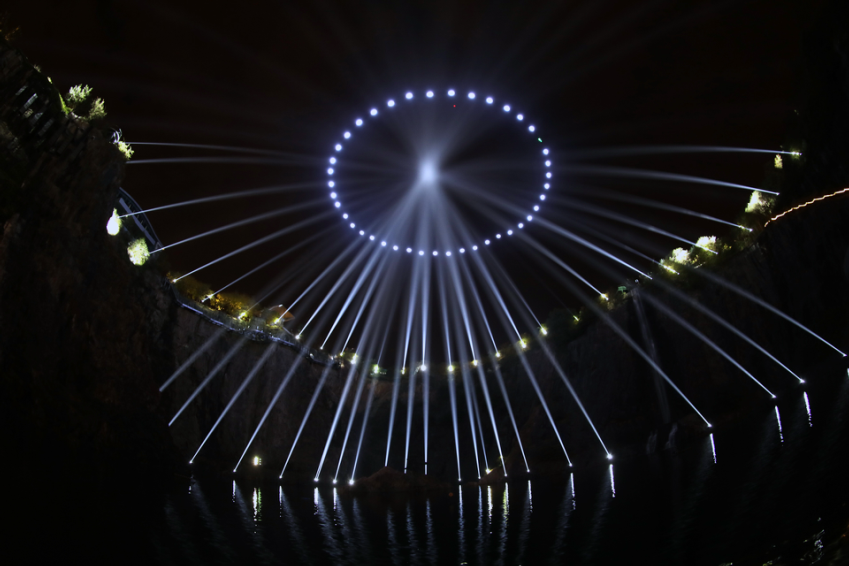 總導(dǎo)演王之綱最初的設(shè)計靈感來自于深坑酒店特殊的結(jié)構(gòu)和位置,建筑在一個環(huán)形深坑里的深坑酒店有著天然的回音結(jié)構(gòu)。因此,在被世茂集團邀請為深坑酒店設(shè)計一場量身打造的新媒體藝術(shù)秀的時候,王之綱提出了“回響”這個概念。
