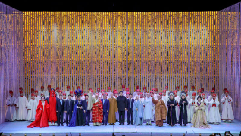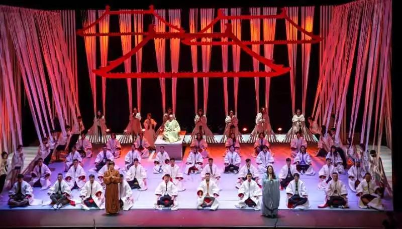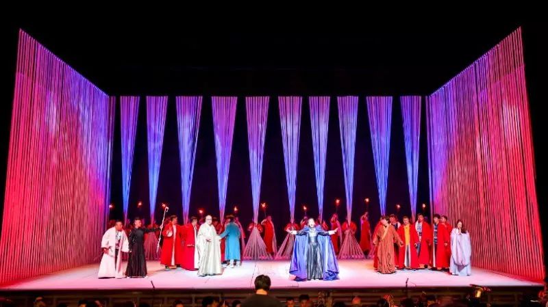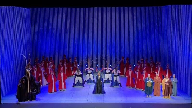 《鑒真東渡》運(yùn)用歌劇這一國際通識的藝術(shù)表達(dá)話語,配合有感染力的表演,富有創(chuàng)意的舞美燈光設(shè)計(jì),生動、立體的人物架構(gòu),在遵循歌劇藝術(shù)規(guī)律的基礎(chǔ)上,創(chuàng)造性地將江蘇民歌元素和佛教音樂的旋律融入其中,讓歌劇更富有地域特色,呈現(xiàn)出不同于純粹西方歌劇的風(fēng)格,展現(xiàn)出東方所特有的歷史厚重感與人文風(fēng)貌。