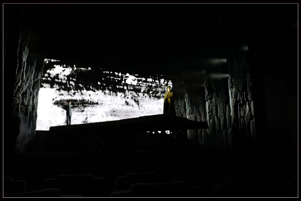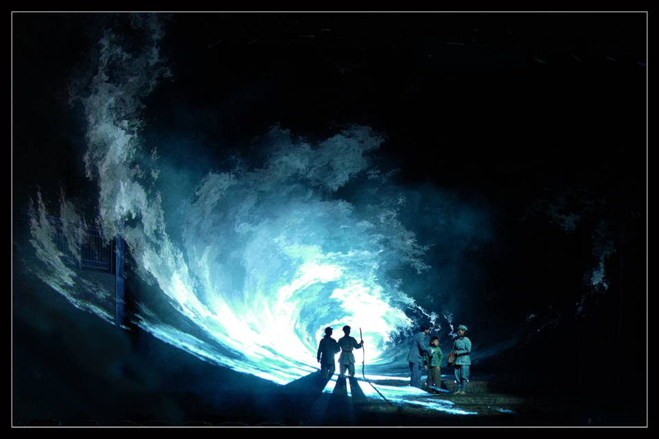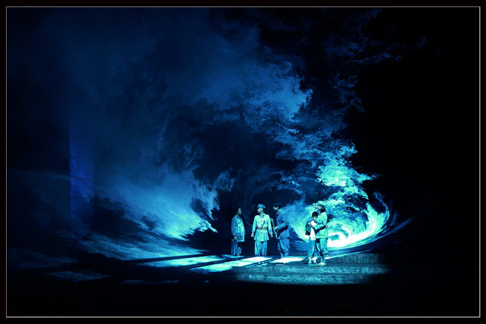 舞臺劇中 “交互式”的藝術表現(xiàn)形式,涵蓋了話劇、舞劇、舞臺美術、音樂、音響、多媒體、燈光等一系列在其中,讓劇目更具有生命力,更具有視覺感官沖擊,能夠?qū)v史重現(xiàn)在觀眾的眼前,呈現(xiàn)一個逼真的全維度感官場景。