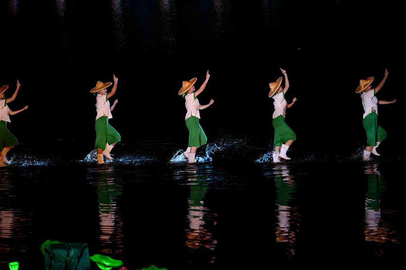 由于實景演出的舞美要求不能破壞大自然的原始形態(tài),因此現(xiàn)場對視覺效果的塑造都押在了燈光創(chuàng)作上,由于現(xiàn)場表演規(guī)模宏大,尤其是在水面上染色,要做到色彩單純,光線分布均勻且具備足夠的亮度,同時保證遠景、近景的清晰可見,給觀眾帶去強烈的視覺感受。