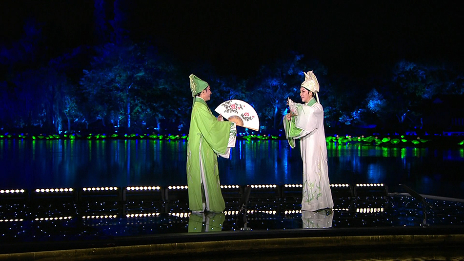 不同于傳統(tǒng)舞臺,利用西湖的自然水面作為表演場地也給《最憶是杭州》文藝晚會的光位設(shè)計帶來了不小的挑戰(zhàn),現(xiàn)場干凈、有力的面光和側(cè)光等光位的運用,使得被照物體清晰可見的同時又塑造了較好的人物輪廓。