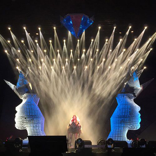 一向?qū)σ魳酚兄鴺O致要求的張惠妹團(tuán)隊(duì),在「烏托邦世界巡城演唱會(huì)」中,更是投重金打造世界級(jí)硬件設(shè)備及舞臺(tái)道具。作為打造演唱會(huì)燈光效果的主力武器,浩洋電子轟天炮G10B憑借全球頂級(jí)的高亮度輸出特性、銳利的光束和完美的棱鏡效果,為“烏托邦”現(xiàn)場(chǎng)營(yíng)造了時(shí)而狂野,時(shí)而歡樂的舞臺(tái)氛圍。而浩洋電子另一款小體積、長(zhǎng)壽命的染色燈PT330W,也用柔和細(xì)膩的CMY均勻渲染效果,令現(xiàn)場(chǎng)似烈果繽紛、如沐幻境。在燈光師的詮釋之下,二者光束與染色交融演繹,使整個(gè)巡演舞臺(tái)呈現(xiàn)出靈動(dòng)、華麗的光影視覺,讓歌迷獲得極具沖擊力的感官體驗(yàn)。數(shù)十場(chǎng)演出下來,由浩洋燈光營(yíng)造的超震撼視覺效果,無疑成為「張惠妹2015烏托邦世界巡城演唱會(huì)」的最大亮點(diǎn)之一。