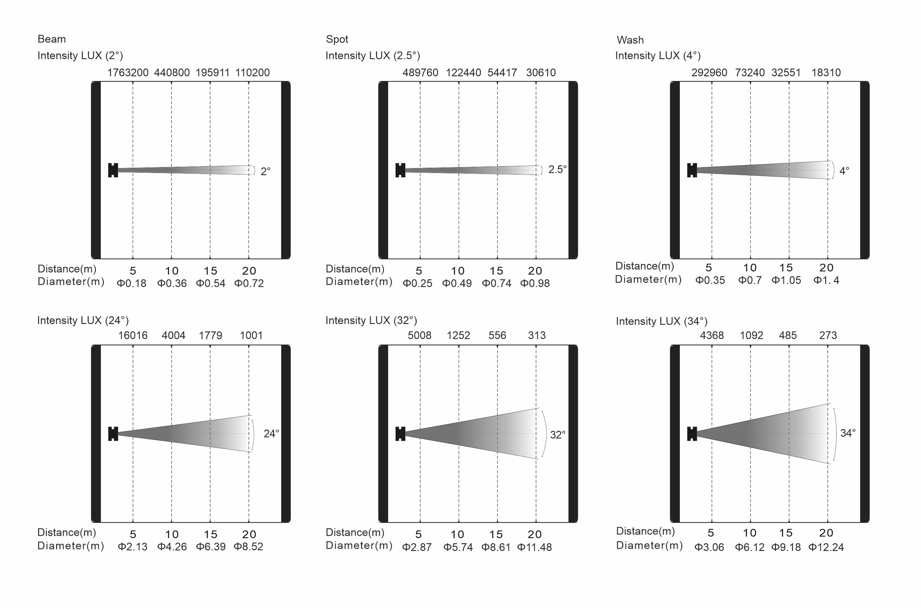 變焦范圍:光束模式:2°-24°,圖案模式:2.5°-32°,染色模式:4°-34°