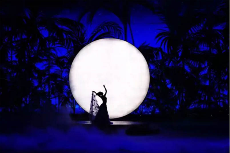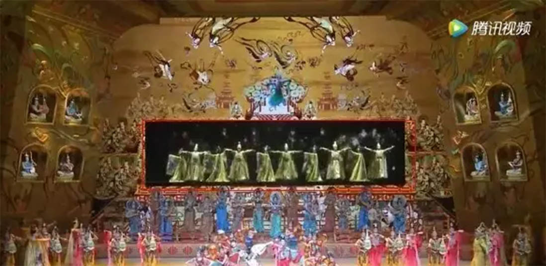 文藝晚會(huì)有效運(yùn)用科技元素,使晚會(huì)的舞美設(shè)計(jì)帶有顯著特色。晚會(huì)多項(xiàng)節(jié)目散發(fā)舞美空間魅力,設(shè)計(jì)師巧妙地把節(jié)目的內(nèi)在意境外化,觀眾也能隨著舞美空間馳騁在想象的旅程中。另外,《千年之約》等節(jié)目中,應(yīng)用了全息投影技術(shù),這也是杭州G20全息技術(shù)的升華應(yīng)用,使壁畫中的人物栩栩如生,實(shí)現(xiàn)真實(shí)的演員和全息影像交替出現(xiàn),與舞臺(tái)燈光完美結(jié)合,形成3D全息效果,達(dá)到似真似幻的效果。