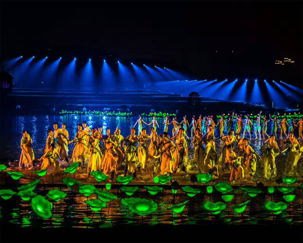 大型田園花火情境實(shí)景演出《瀏陽(yáng)河上》是浩洋團(tuán)隊(duì)繼湖南常德首臺(tái)城市風(fēng)情實(shí)景秀《夢(mèng)回穿紫河》重大燈光工程后的又一力作。該燈光工程共使用浩洋電子旗下特寶麗品牌IP65全能王三合一電腦燈、全能王三合一電腦燈G12 HYBRID、切割燈V3000P、追光燈FS800M、防水固定染色燈OVAL 48D、LED條燈等近1200臺(tái)專(zhuān)業(yè)舞臺(tái)燈。通過(guò)燈光設(shè)計(jì)與演出內(nèi)容的緊密結(jié)合,通過(guò)序曲和三大主題篇章,彰顯其多樣氣質(zhì)。