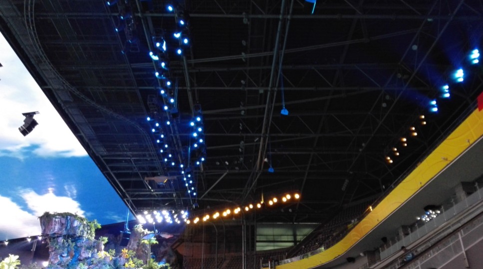 為更真實(shí)的反應(yīng)恐龍世界的自然環(huán)境,《遠(yuǎn)去的恐龍》將6000㎡高清LED巨幕組成舞臺(tái)的環(huán)幕背景和天空穹頂,這一創(chuàng)作突破了舞臺(tái)空間的枷鎖,在國(guó)家體育館這一密閉場(chǎng)館內(nèi),開(kāi)辟了恐龍世界深遠(yuǎn)無(wú)際的遠(yuǎn)景和天空。而在觀眾席以外的場(chǎng)館空間,《遠(yuǎn)去的恐龍》構(gòu)建了表面積達(dá)11000㎡巨大的高度仿生的山、水、林木實(shí)體場(chǎng)景,將恐龍世界的地容、地貌完美地搬進(jìn)了國(guó)家體育館。