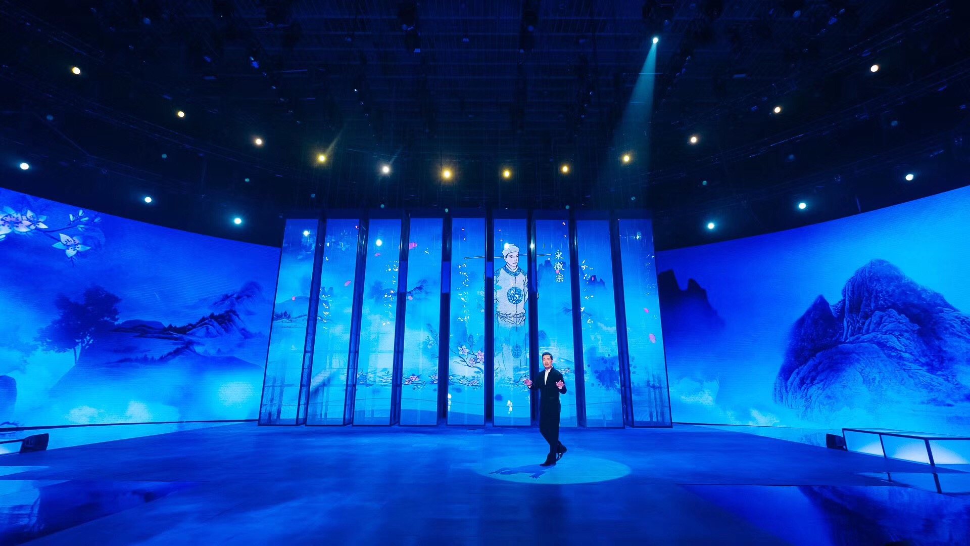 在舞美方面,《國(guó)家寶藏》節(jié)目組特別將所有舞臺(tái)主視覺(jué)都設(shè)置在一塊長(zhǎng)43米、高7米的巨型LED環(huán)幕上,讓觀眾在見(jiàn)不到國(guó)寶實(shí)物的情況下也能以直觀的感受體驗(yàn)到國(guó)寶的震撼美。在整個(gè)舞臺(tái)的設(shè)計(jì)上,節(jié)目組將中國(guó)古典韻味和現(xiàn)代舞臺(tái)科技相結(jié)合,融合紗盒投影視覺(jué)呈現(xiàn)、透視冰屏柱視覺(jué)呈現(xiàn)、透視冰屏柱臺(tái)型變幻、巨型環(huán)幕視覺(jué)呈現(xiàn)四大特點(diǎn)于一體。在場(chǎng)景環(huán)境的構(gòu)建與更替上都呈現(xiàn)出精致逼真的舞臺(tái)效果,這種舞臺(tái)視覺(jué)上的極致沖擊力也成為節(jié)目吸引眼球的一大亮點(diǎn)。