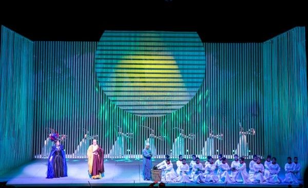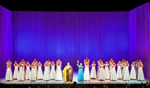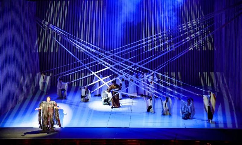 《鑒真東渡》運用歌劇這一國際通識的藝術(shù)表達話語,配合有感染力的表演,富有創(chuàng)意的舞美燈光設(shè)計,生動、立體的人物架構(gòu),在遵循歌劇藝術(shù)規(guī)律的基礎(chǔ)上,創(chuàng)造性地將江蘇民歌元素和佛教音樂的旋律融入其中,讓歌劇更富有地域特色,呈現(xiàn)出不同于純粹西方歌劇的風格,展現(xiàn)出東方所特有的歷史厚重感與人文風貌。